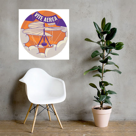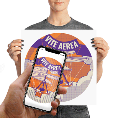 La vite aerea di Leonardo è stata interpretata per anni come studio sul volo. Scoperte recenti hanno rivelato che, in realtà, consisteva in un’indagine sulla compressione dell’energia nella molla alla base della vela, che avrebbe portato la struttura a volare in verticale per poi ricadere a terra finita la spinta accumulata. L’illustrazione riprende il mondo pop della stampa con retini e tinte piatte.